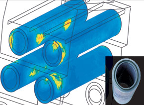 先進的FLUENT軟件模擬流體動力學,結構力學和聲學分別模擬了DFO型號1-1,2-2,3-3的性能等級。而下面(左圖)顯示了利用FLUENT軟件作流量測試,從而令DFO 3-3內部的氣流速度更均勻分布。另外下右圖顯示了利用ANSYS®*結構分析軟件測試DFO 3-3,在正常工作壓下之內部壓力分布測試。